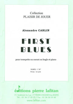 Le fichier PDF de l'oeuvre "First blues", pour trompette ou cornet ou bugle et piano, comprend : 1 page de garde, le conducteur trompette-piano (2 pages), la partie de trompette sib / cornet sib / bugle sib seuls (1 page), la partie de trompette ut seule (1 page) et la liste des œuvres d’Alexandre Carlin pour trompette et piano, publiées aux Editions Pierre Lafitan (1 page). Soit 6 pages au total. Le poids du fichier PDF est : 209 Ko.