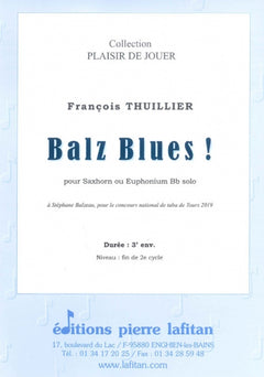 Le fichier PDF de l'oeuvre "Balz Blues !", pour saxhorn ou euphonium Bb solo, comprend : 1 page de garde, la partie de saxhorn ou euphonium Bb solo (2 pages) et la biographie de François Thuillier avec sa photo (1 page). Soit 4 pages au total. Le poids du fichier PDF est : 222 Ko.