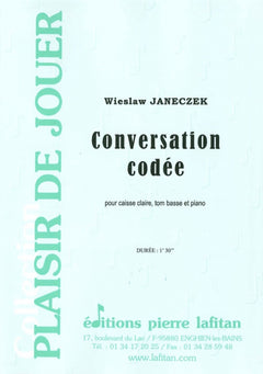 Le fichier PDF de l'oeuvre "Conversation codée", pour caisse claire, tom basse et piano, comprend : 1 page de garde, les symboles et conseils de disposition (1 page), le conducteur caisse claire-tom basse-piano (3 pages) et la partie de caisse claire-tom basse seule (1 page). Soit 6 pages au total. Le poids du fichier PDF est : 122 Ko.