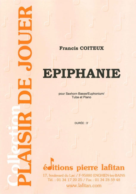 Le fichier PDF de l'oeuvre "Epiphanie", pour saxhorn basse/euphonium/tuba et piano, comprend : 1 page de garde, le conducteur saxhorn basse-piano (4 pages), la partie de saxhorn basse ou euphonium sib clé de fa seul (1 page), la partie de saxhorn basse ou euphonium sib clé de sol seul (1 page), la partie de tuba ut seul (1 page). Soit 8 pages au total. Le poids du fichier PDF est : 114 Ko.