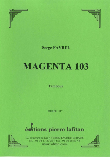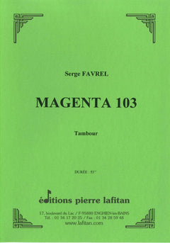 Le fichier PDF de l'oeuvre "Magenta 103", pour tambour seul, comprend : 1 page de garde et la partition de tambour (1 page). Soit 2 pages au total. Le poids du fichier PDF est : 35,90 Ko.
