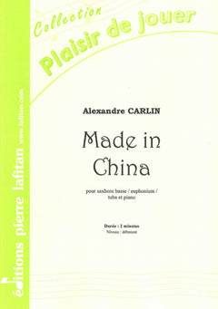 Le fichier PDF de l'oeuvre "Made in China", pour saxhorn / euphonium / tuba et piano, comprend : 1 page de garde, le conducteur saxhorn basse-piano (3 pages), la partie de saxhorn basse ou euphonium sib clé de fa seul (1 page), la partie de saxhorn basse ou euphonium sib clé de sol seul (1 page), la partie de tuba ut seul (1 page), la liste des œuvres pour saxhorn basse d’Alexandre Carlin publiées aux Editions Pierre Lafitan (1 page). Soit 8 pages au total. Le poids du fichier PDF est : 127 Ko.