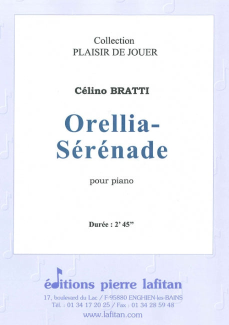 Le fichier PDF de l'oeuvre "Orellia-Sérénade" comprend : 1 page de garde, la partition de piano (4 pages) et la liste des œuvres pour piano de Célino Bratti publiées aux Editions Pierre Lafitan (1 page). Soit 6 pages au total. Le poids du fichier PDF est : 122 Ko.
