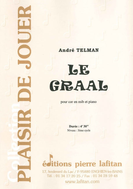 Le fichier PDF de l'oeuvre "Le Graal", pour cor naturel mib et piano, comprend : 1 page de garde, le conducteur cor mib-piano (5 pages), la partie de cor mib seul (3 pages) et la liste des œuvres d’André Telman pour cor naturel mib, publiées aux Editions Pierre Lafitan (1 page). Soit 10 pages au total. Le poids du fichier PDF est : 194 Ko.