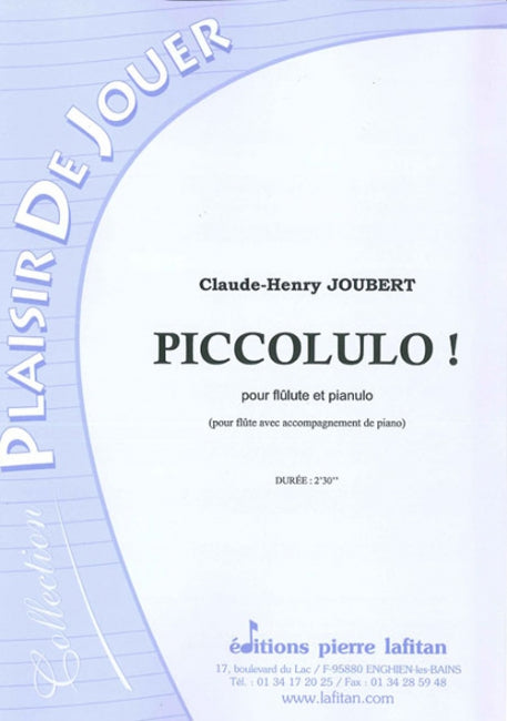 Le fichier PDF de l'oeuvre "Piccolulo !", pour flûte avec accompagnement de piano, comprend : 1 page de garde, le conducteur flûte-piano (6 pages), la partie de flûte seule (3 pages) et la liste des œuvres pour flûte de Claude-Henry Joubert, publiées aux Editions Pierre Lafitan (1 page). Soit 11 pages au total. Le poids du fichier PDF est : 156 Ko.