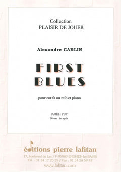 Le fichier PDF de l'oeuvre "First blues", pour cor d'harmonie et piano, comprend : 1 page de garde, le conducteur cor-piano (2 pages), la partie de cor fa seul (1 page), la partie de cor mib seul (1 page), la biographie d’Alexandre Carlin avec sa photo et la liste de ses œuvres pour cor d’harmonie, publiées aux Editions Pierre Lafitan (1 page). Soit 6 pages au total. Le poids du fichier PDF est : 224 Ko.
