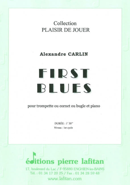 Le fichier PDF de l'oeuvre "First blues", pour trompette ou cornet ou bugle et piano, comprend : 1 page de garde, le conducteur trompette-piano (2 pages), la partie de trompette sib / cornet sib / bugle sib seuls (1 page), la partie de trompette ut seule (1 page) et la liste des œuvres d’Alexandre Carlin pour trompette et piano, publiées aux Editions Pierre Lafitan (1 page). Soit 6 pages au total. Le poids du fichier PDF est : 209 Ko.