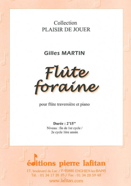 Le fichier PDF de l'oeuvre "Flûte foraine", pour flûte traversière et piano, comprend : 1 page de garde, le conducteur flûte-piano (4 pages), la partie de flûte traversière seule (2 pages) et la liste des œuvres de Gilles Martin, publiées aux Editions Pierre Lafitan (1 page). Soit 8 pages au total. Le poids du fichier PDF est : 262 Ko.