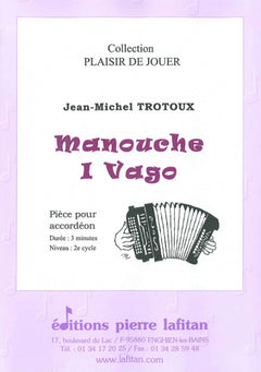 Le fichier PDF de l'oeuvre "Manouche I Vago", pour accordéon basses composées, comprend : 1 page de garde, la partie d’accordéon (4 pages) et la biographie du compositeur Jean-Michel Trotoux avec sa photo (1 page). Soit 6 pages au total. Le poids du fichier PDF est : 170 Ko.