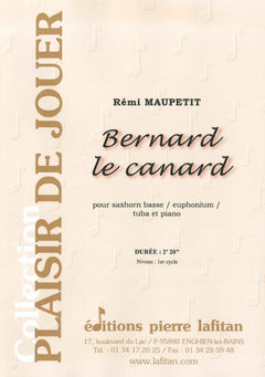 Le fichier PDF de l'oeuvre "Bernard le canard", pour saxhorn basse / euphonium / tuba et piano, comprend : 1 page de garde, le conducteur saxhorn basse-piano (5 pages), la partie de saxhorn basse-euphonium sib clé de fa seul (1 page), la partie de saxhorn basse-euphonium sib clé de sol seul (1 page), et la partie de tuba ut seul (1 page). Soit 9 pages au total. Le poids du fichier PDF est : 196 Ko.