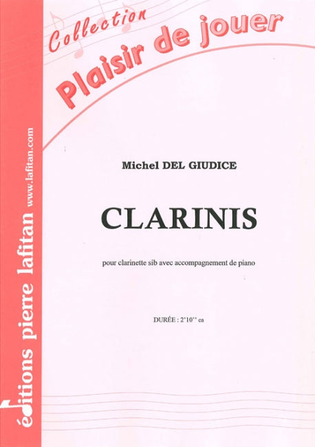 Le fichier PDF de l'oeuvre "Clarinis", pour clarinette sib avec accompagnement de piano, comprend : 1 page de garde, le conducteur clarinette-piano (3 pages), la partie de clarinette sib seule (2 pages) et la liste des œuvres de Michel Del Giudice, publiées aux Editions Pierre Lafitan (1 page). Soit 7 pages au total. Le poids du fichier PDF est : 109 Ko.