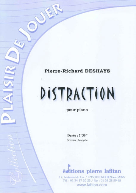 Le fichier PDF de l'oeuvre "Distraction", pour piano, comprend : 1 page de garde et la partition de piano (4 pages). Soit 5 pages au total. Le poids du fichier PDF est : 133 Ko.