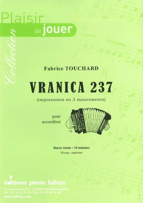 Le fichier PDF de l'oeuvre "Vranica 237", pour accordéon, comprend : 1 page de garde et la partie d’accordéon (12 pages). Soit 13 pages au total, format A4. Le poids du fichier PDF est : 190 Ko.