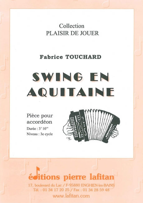 Le fichier PDF de l'oeuvre "Swing en Aquitaine", pour accordéon solo, basses standards, comprend : 1 page de garde, la partie d’accordéon (4 pages) et la biographie du compositeur avec sa photo (1 page). Soit 6 pages au total. Le poids du fichier PDF est : 213 Ko.