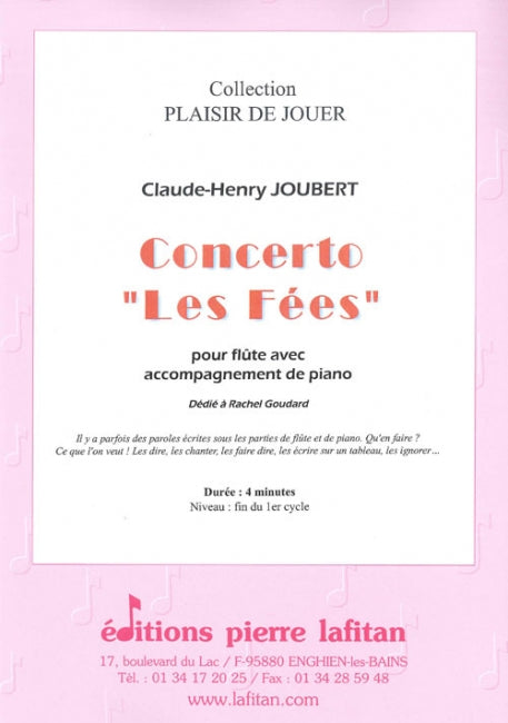 Le fichier PDF de l'oeuvre "Concerto "Les Fées", pour flûte avec accompagnement de piano, comprend : 1 page de garde, le conducteur flûte-piano (8 pages), la partie de flûte seule (4 pages) et la biographie du compositeur Claude-Henry Joubert avec sa photo (1 page). Soit 14 pages au total. Le poids du fichier PDF est : 302 Ko.
