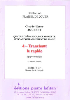 Le fichier PDF de l'oeuvre "Tranchant le rapide", pour clarinette avec accompagnement de piano, comprend : 1 page de garde, la présentation de la pièce par le compositeur (1 page), le conducteur clarinette-piano (10 pages), la partie de clarinette seule (4 pages), la biographie de Claude-Henry Joubert avec sa photo (1 page) et la liste des œuvres pour clarinette (avec accompagnement de piano) de Claude-Henry Joubert, éditées aux Editions Pierre Lafitan (1 page). Soit 18 pages au total. Le poids du fichier PDF est : 328 Ko.