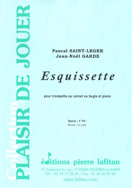 Le fichier PDF de l'oeuvre "Esquissette", pour trompette ou cornet ou bugle et piano, comprend : 1 page de garde, le conducteur trompette-piano (3 pages), la partie de trompette sib / cornet sib / bugle sib seuls (1 page) et la partie de trompette ut seule (1 page). Soit 6 pages au total. Le poids du fichier PDF est : 122 Ko.
