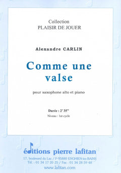 Le fichier PDF de l'oeuvre "Comme une valse", pour saxophone alto et piano, comprend : 1 page de garde, le conducteur saxophone alto-piano (3 pages), la partie de saxophone alto mib seul (2 pages) et la liste des œuvres pour saxophone alto et piano d’Alexandre Carlin, publiées aux Editions Pierre Lafitan (1 page). Soit 7 pages au total. Le poids du fichier PDF est : 204 Ko.