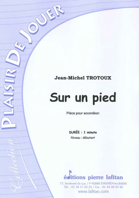 Le fichier PDF de l'oeuvre "Sur un pied", pour accordéon, comprend : 1 page de garde, la biographie du compositeur avec sa photo (1 page), la partie d’accordéon (2 pages) et le catalogue des œuvres pour accordéon de Jean-Michel Trotoux aux Editions Pierre Lafitan. Soit 5 pages au total. Le poids du fichier PDF est : 157 Ko.