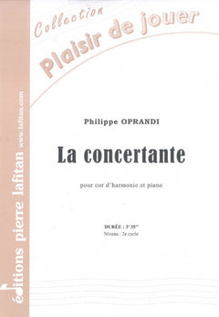 Le fichier PDF de l'oeuvre "La concertante", pour cor d’harmonie et piano, comprend : 1 page de garde, le conducteur cor d’harmonie-piano (6 pages), la partie de cor en fa seul (3 pages), la partie de cor mib seul (3 pages) et la liste des œuvres pour cor de Philippe Oprandi, publiées aux Editions Pierre Lafitan (1 page). Soit 14 pages au total. Le poids du fichier PDF est : 189 Ko.