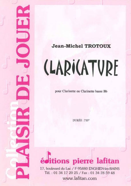Le fichier PDF de l'oeuvre "Claricature", pour clarinette sib (ou clarinette basse) seule, comprend : 1 page de garde, la biographie du compositeur avec sa photo (1 page) et la partition de clarinette (2 pages). Soit 4 pages au total. Le poids du fichier PDF est : 225 Ko.