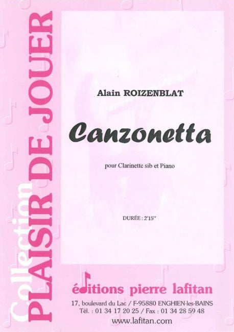 Le fichier PDF de l'oeuvre "Canzonetta", d’Alain Roizenblat, pour clarinette sib et piano, comprend : 1 page de garde, le conducteur clarinette-piano (4 pages) et la partie de clarinette sib seule (2 pages). Soit 7 pages au total. Le poids du fichier PDF est : 104 Ko.