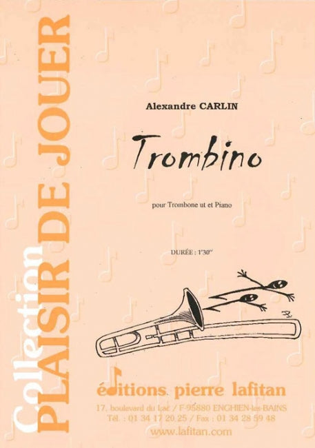 Le fichier PDF de l'oeuvre "Trombino", pour trombone et piano, comprend : 1 page de garde, le conducteur trombone-piano (2 pages) et la partie de trombone ut seul (1 page). Soit 4 pages au total. Le poids du fichier PDF est : 94,0 Ko.