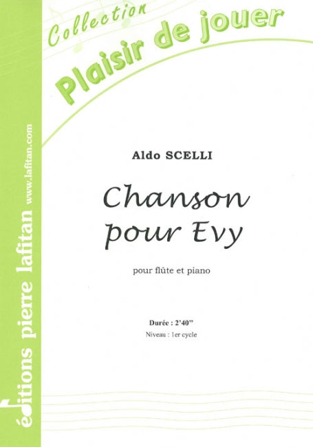 Le fichier PDF de l'oeuvre "Chanson pour Evy", pour flûte et piano, comprend : 1 page de garde, le conducteur flûte-piano (4 pages) et la partie de flûte seule (1 page). Soit 6 pages au total. Le poids du fichier PDF est : 128 Ko.