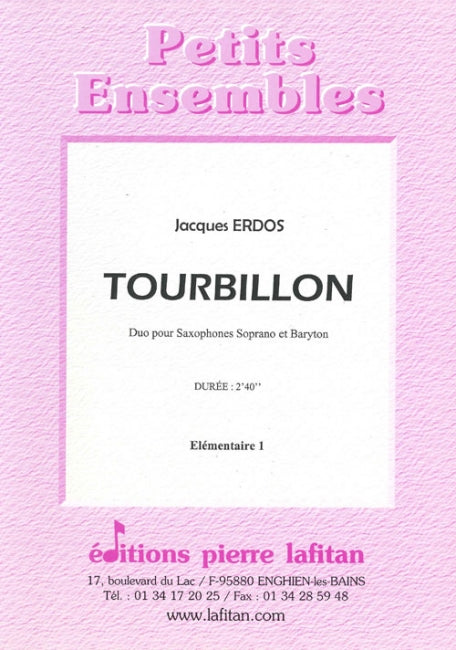 Le fichier PDF de l'oeuvre "Tourbillon", pour saxophone soprano et saxophone baryton en duo, comprend : 1 page de garde, le conducteur regroupant les parties de saxophone soprano et de saxophone baryton (1 page), la partie de saxophone soprano sib seul (1 page) et la partie de saxophone baryton mib seul (1 page). Soit 4 pages au total. Le poids du fichier PDF est : 106 Ko.