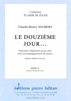 Le fichier PDF de l'oeuvre "Le Douzième jour…", pour alto avec accompagnement de piano, comprend : 1 page de garde, le conducteur alto-piano (7 pages), la partie d’alto seul (3 pages) et la liste des oeuvres pour alto de Claude-Henry Joubert, publiées aux Editions Pierre Lafitan (1 page). Soit 12 pages au total. Le poids du fichier PDF est : 241 Ko.