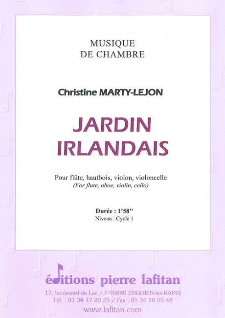 Le fichier PDF de l'oeuvre "Jardin irlandais", pour quatuor mixte bois-cordes, comprend : 1 page de garde, le conducteur (4 pages), la partie de flûte (1 page), la partie de hautbois (1 page), la partie de violon (1 page), la partie de violoncelle (1 page), 1 page comportant la biographie de la compositrice avec sa photo. Soit 10 pages au total. Le poids du fichier PDF est : 244 Ko.