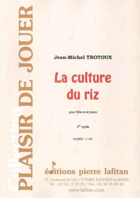 Le fichier PDF de l'oeuvre "La culture du riz", pour flûte traversière et piano, comprend : 1 page de garde, le conducteur flûte-piano (2 pages), la partie de flûte traversière seule (1 page) et la liste des œuvres pour flûte et piano de Jean-Michel Trotoux aux Editions Pierre Lafitan (1 page). Soit 5 pages au total. Le poids du fichier PDF est : 114 Ko.