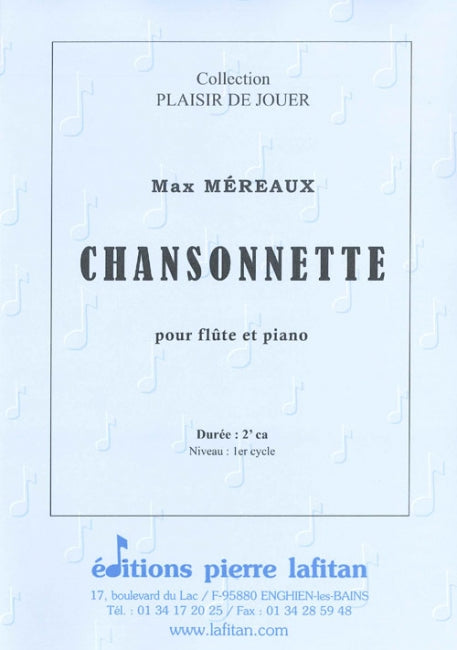 Le fichier PDF de l'oeuvre "Chansonnette", pour flûte et piano, comprend : 1 page de garde, le conducteur flûte-piano (4 pages) et la partie de flûte seule (1 page). Soit 6 pages au total. Le poids du fichier PDF est : 122 Ko.