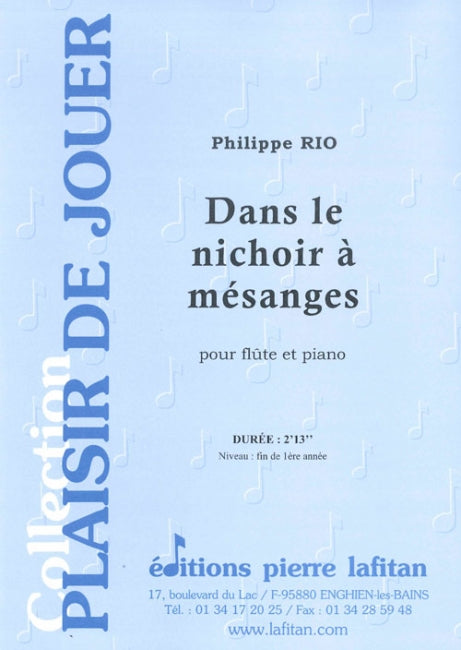 Le fichier PDF de l'oeuvre "Dans le nichoir à mésanges", pour flûte et piano, comprend : 1 page de garde, la présentation de la pièce par Philippe Rio (1 page), le conducteur flûte-piano (4 pages) et la partie de flûte seule (1 page). Soit 7 pages au total. Le poids du fichier PDF est : 142 Ko.