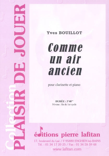 Le fichier PDF de l'oeuvre "Comme un air ancien", pour clarinette et piano, comprend : 1 page de garde, le conducteur clarinette-piano (6 pages) et la partie de clarinette sib seule (2 pages). Soit 9 pages au total. Le poids du fichier PDF est : 216 Ko.