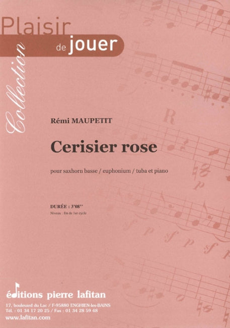 Le fichier PDF de l'oeuvre "Cerisier rose", pour saxhorn basse / euphonium / tuba et piano, comprend : 1 page de garde, le conducteur saxhorn basse-piano (5 pages), la partie de saxhorn basse ou euphonium sib clé de fa seul (2 pages), la partie de saxhorn basse ou euphonium sib clé de sol seul (2 pages), la partie d’euphonium ut seul (2 pages) et la partie de tuba basse ut seul (2 pages). Soit 14 pages au total. Le poids du fichier PDF est : 279 Ko.