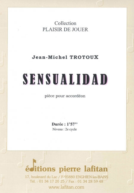 Le fichier PDF de l'oeuvre "Sensualidad", pour accordéon solo, comprend : 1 page de garde, la partition d’accordéon (2 pages) et la liste des œuvres pour accordéon de Jean-Michel Trotoux aux Editions Pierre Lafitan (1 page). Soit 4 pages au total. Le poids du fichier PDF est : 143 Ko.