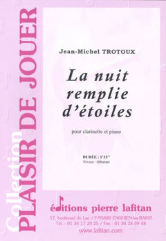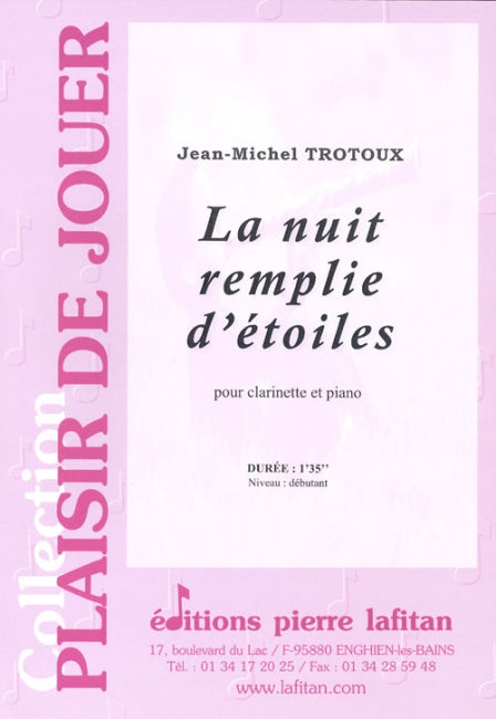 Le fichier PDF de l'oeuvre "La nuit remplie d’étoiles", pour clarinette et piano, comprend : 1 page de garde, le conducteur clarinette-piano (2 pages) et la partie de clarinette en sib seule (1 page). Soit 4 pages au total. Le poids du fichier PDF est : 168 Ko.
