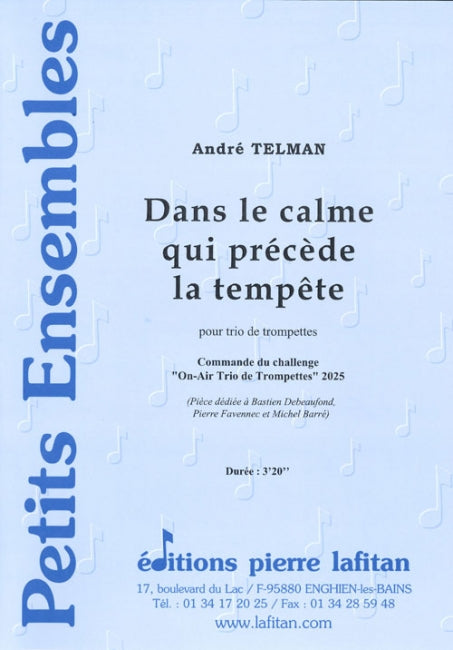 Le fichier PDF de l'oeuvre "Dans le calme qui précède la tempête", pour trio de trompettes, comprend : 1 page de garde, le conducteur (4 pages), la partie de trompette sib 1 (2 pages), la partie de trompette sib 2 (2 pages) et la partie de trompette sib 3 (2 pages). Soit 11 pages au total. Le poids du fichier PDF est : 212 Ko.