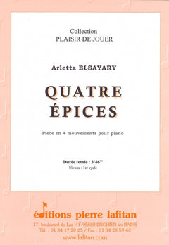Le fichier PDF de l'oeuvre "Quatre épices", pour piano solo, comprend : 1 page de garde, la partie de piano (4 pages) et les titres et durées des 4 mouvements (1 page). Soit 6 pages au total. Le poids du fichier PDF est : 129 Ko.