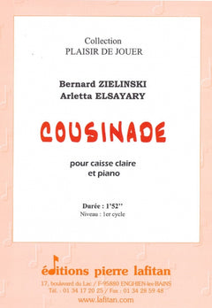 Le fichier PDF de l'oeuvre "Cousinade", pour caisse claire et piano, comprend : 1 page de garde, le conducteur caisse claire-piano (4 pages), la partie de caisse claire seule (1 page) et la liste des œuvres de Bernard Zielinski et Arletta Elsayary, publiées aux Editions Pierre Lafitan (1 page). Soit 7 pages au total. Le poids du fichier PDF est : 156 Ko.