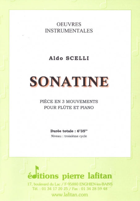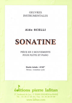 Le fichier PDF de l'oeuvre "Sonatine", pour flûte et piano, comprend : 1 page de garde, le conducteur flûte-piano (10 pages), la partie de flûte seule (4 pages) et la biographie du compositeur Aldo Scelli, avec sa photo (1 page). Soit 16 pages au total. Le poids du fichier PDF est : 353 Ko.