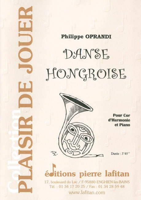 Le fichier PDF de l'oeuvre "Danse hongroise", pour cor d’harmonie et piano comprend : 1 page de garde, le conducteur cor-piano (7 pages), la partie de cor fa seul (2 pages) et la partie de cor mib seul (2 pages). Soit 12 pages au total. Le poids du fichier PDF est : 152 Ko.
