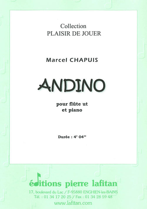 Le fichier PDF de l'oeuvre "Andino", pour flûte et piano, comprend : 1 page de garde, le conducteur flûte-piano (5 pages) et la partie de flûte seule (3 pages). Soit 9 pages au total. Le poids du fichier PDF est : 150 Ko.