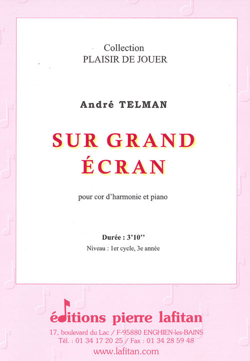 Le fichier PDF de l'oeuvre "Sur grand écran", pour cor d’harmonie et piano, comprend : 1 page de garde, le conducteur cor-piano (5 pages), la partie de cor en fa seul (1 page), la partie de cor mib seul (1 page) et la présentation du compositeur André Telman par l’éditeur Pierre Lafitan (1 page). Soit 9 pages au total. Le poids du fichier PDF est : 202 Ko.