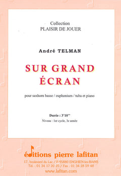 Le fichier PDF de l'oeuvre "Sur grand écran", pour saxhorn basse / euphonium / tuba et piano, comprend : 1 page de garde, le conducteur saxhorn basse-piano (5 pages), la partie de saxhorn basse ou euphonium sib clé de fa seul (1 page), la partie de saxhorn basse ou euphonium sib clé de sol seul (1 page), la partie d’euphonium ut seul (1 page), la partie de tuba basse ut seul (1 page) et la présentation du compositeur André Telman par l’éditeur Pierre Lafitan (1 page). Soit 11 pages au total. Le poids du fichier PDF est : 271 Ko.